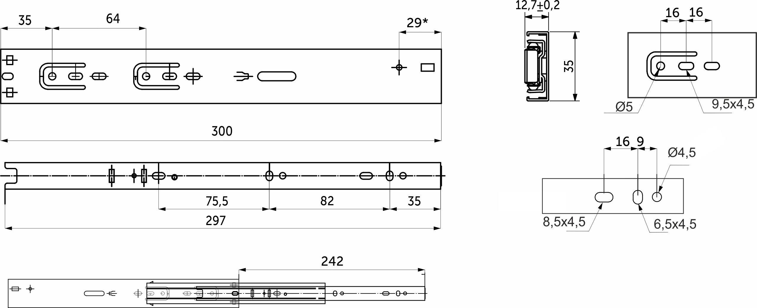 Направляющие для ящиков в 35-мм высоте оснащены доводчиком двупружинным. Имеет усиленные толщины 1,2 из холоднокатаной стали. Направляющие рассчитаны на постоянную нагрузку в 25 кг со сроком службы минимум 40 000 циклов. Имеют шарикоподшипниковые механизмы и телескопическую структуру, что обеспечивает полное выдвижение ящика (за исключением L-300 в связи с особенностью механизма имеется потеря 5см). Доступные длины от 300 до 600 мм. Функция сброса и бесшумного самодоката.