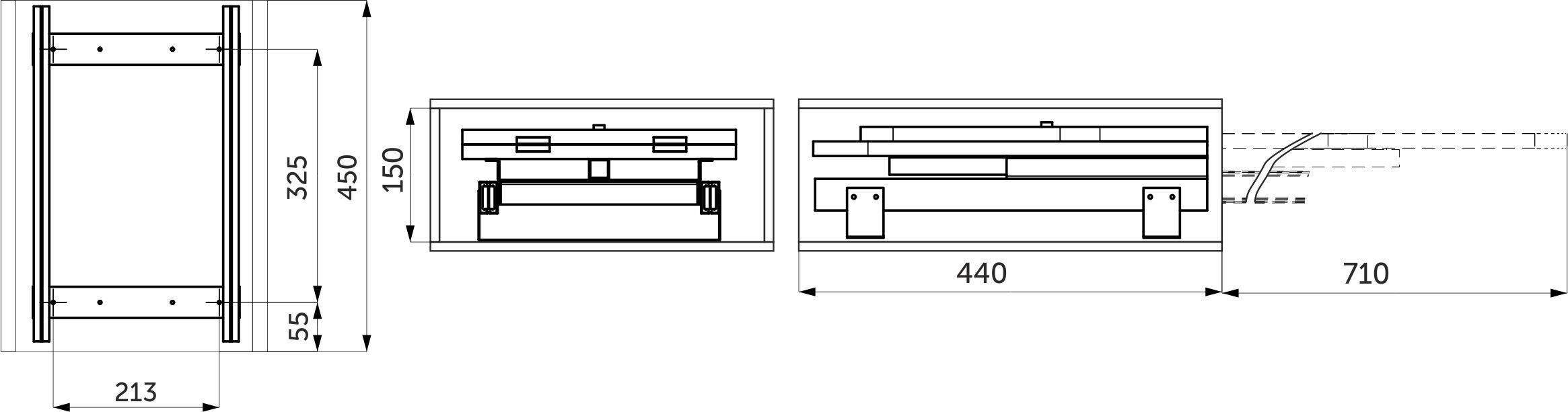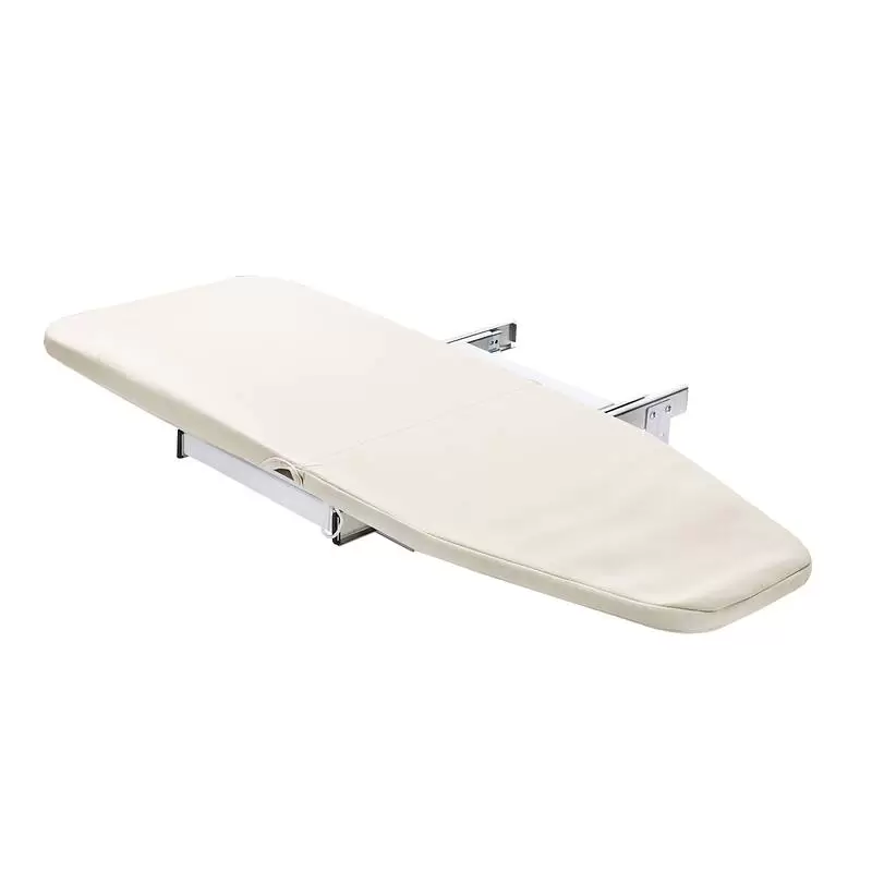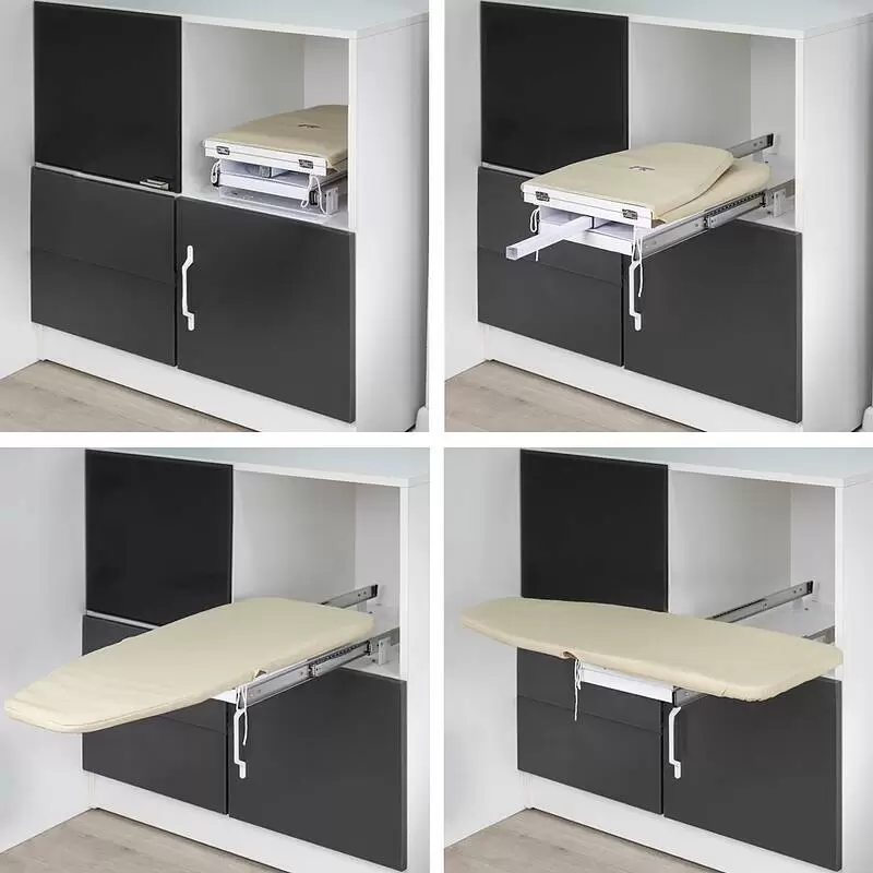 Удобный и компактный вариант гладильной доски для экономии пространства. Гладильная доска монтируется внутрь шкафчика на горизонтальную жестко зафиксированную поверхность. Выдвижение происходит на шариковых направляющих. Есть функция поворота на 90 градусов вправо или влево.