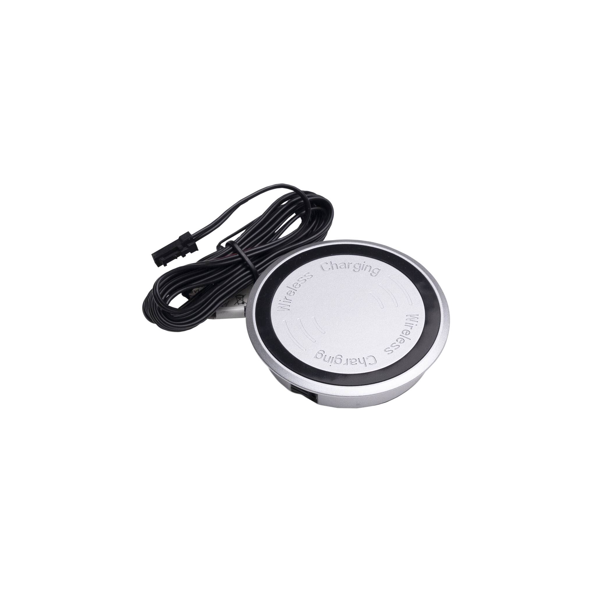 Бесконтактная зарядка для мебели D70x16мм, IP44, без блока питания, рекомендуемый блок питания от 30Вт, макс. мощность 15Вт, IP44, длина кабеля 2м, материал корпуса пластик, рекомендуется блок 75 056. Телефон должен поддерживать функцию зарядки Qi.
