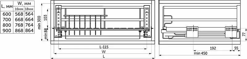 - подходит для фасадов шириной 600 / 700 / 800 / 900 мм, рекомендованная высота фасада до 400 мм.
