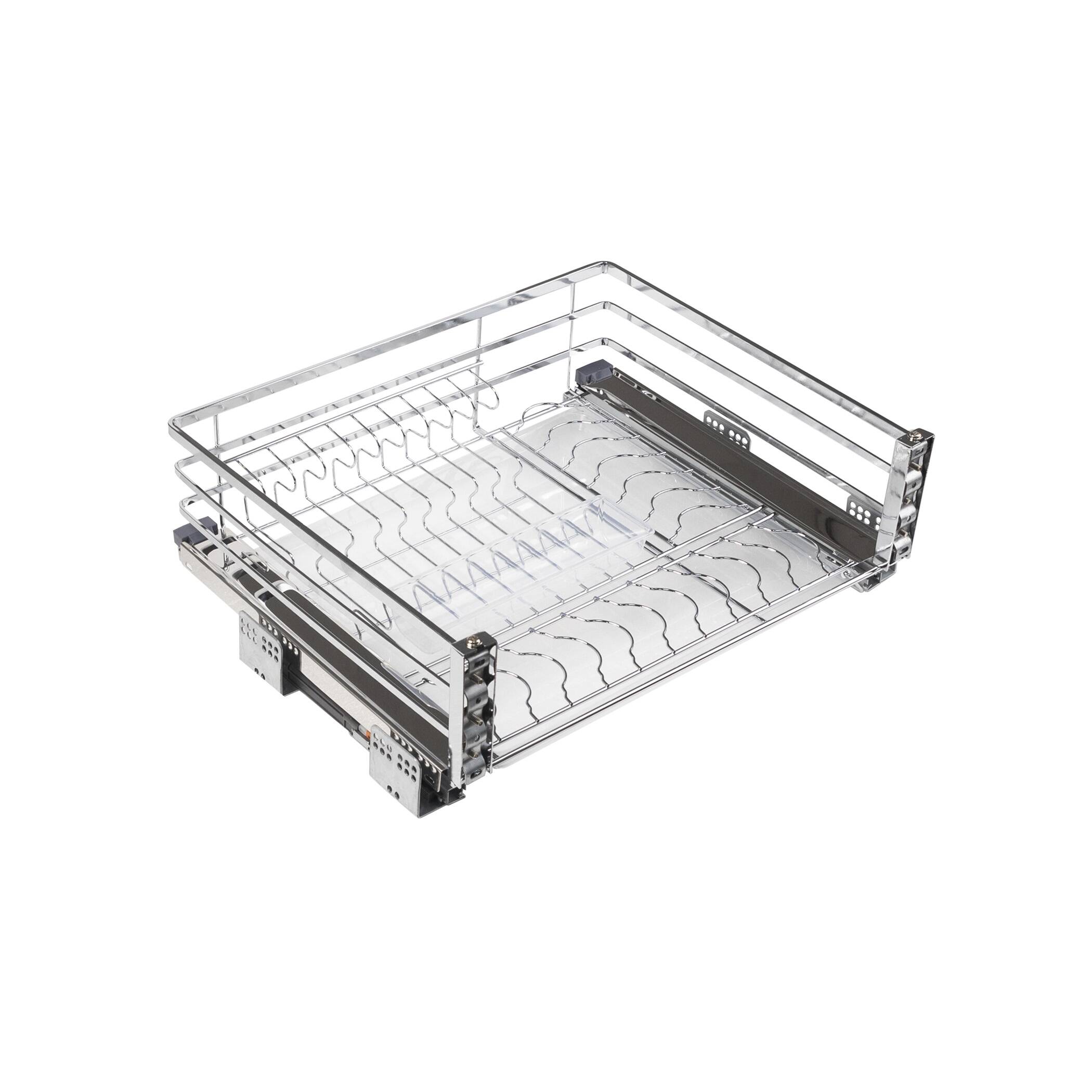 Корзина изготовлена из нержавеющей стали, плоский прут, направляющие скрытого монтажа с доводчиком, крепление к фасаду с 3D-регулировкой. В комплект входит пластиковый поддон и пластиковый вкладыш для столовых приборов. декоративные защитные планки для направляющих.