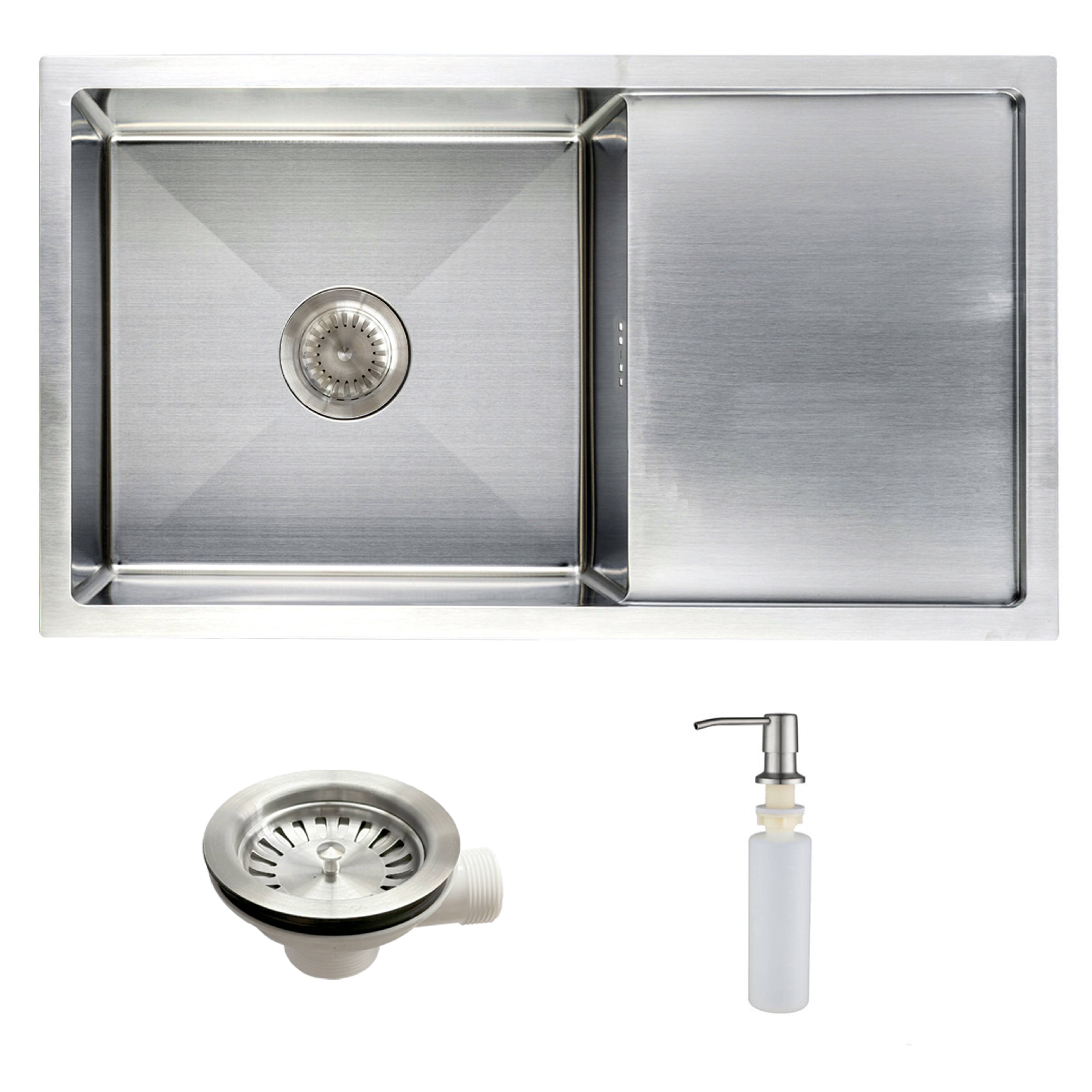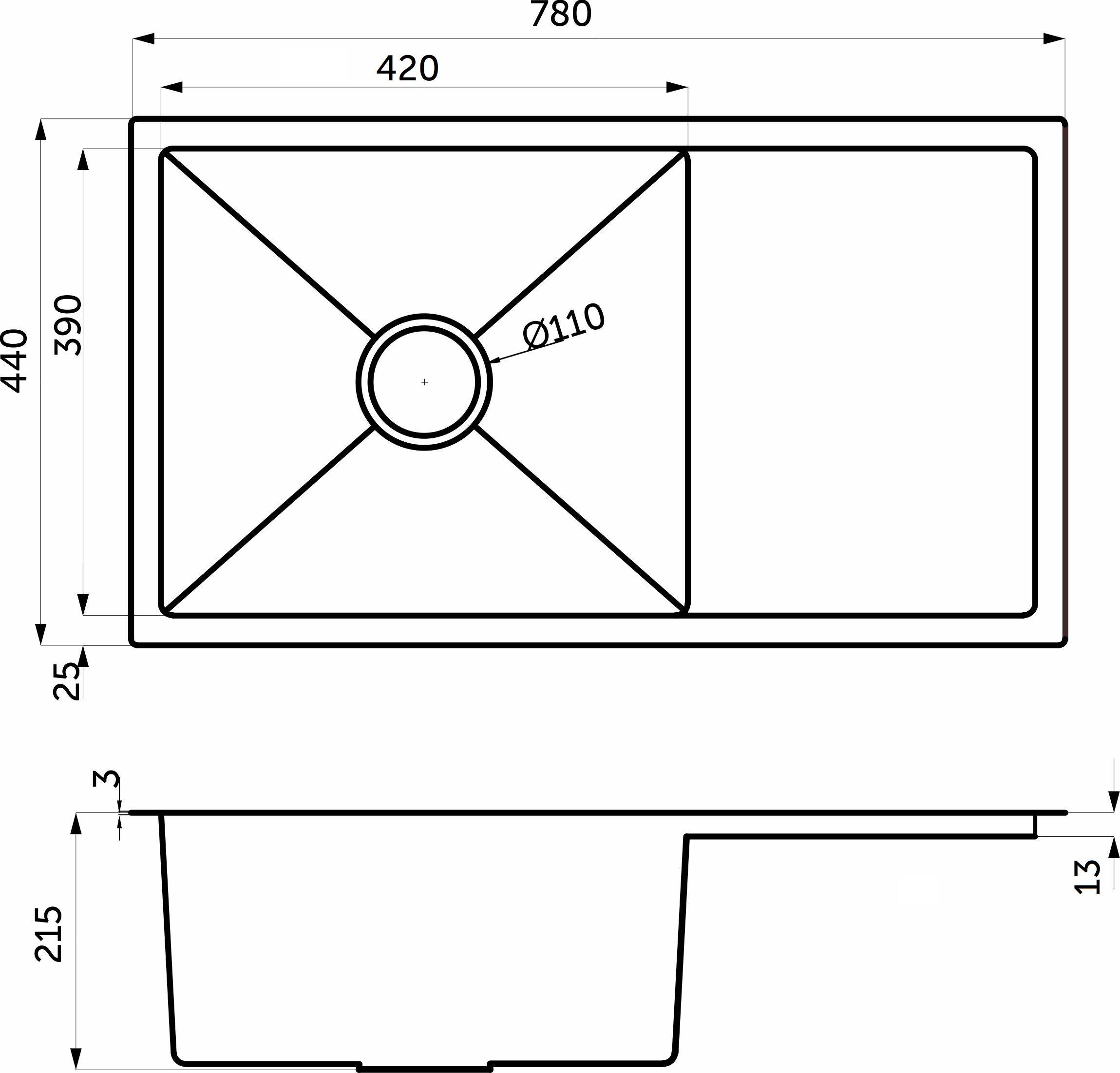 Мойка н/сталь, прямоугольная одночашевая, 780*440мм, мат сатин, PVD, мойка слева, с крылом, универсальная, AKS (3,2мм)