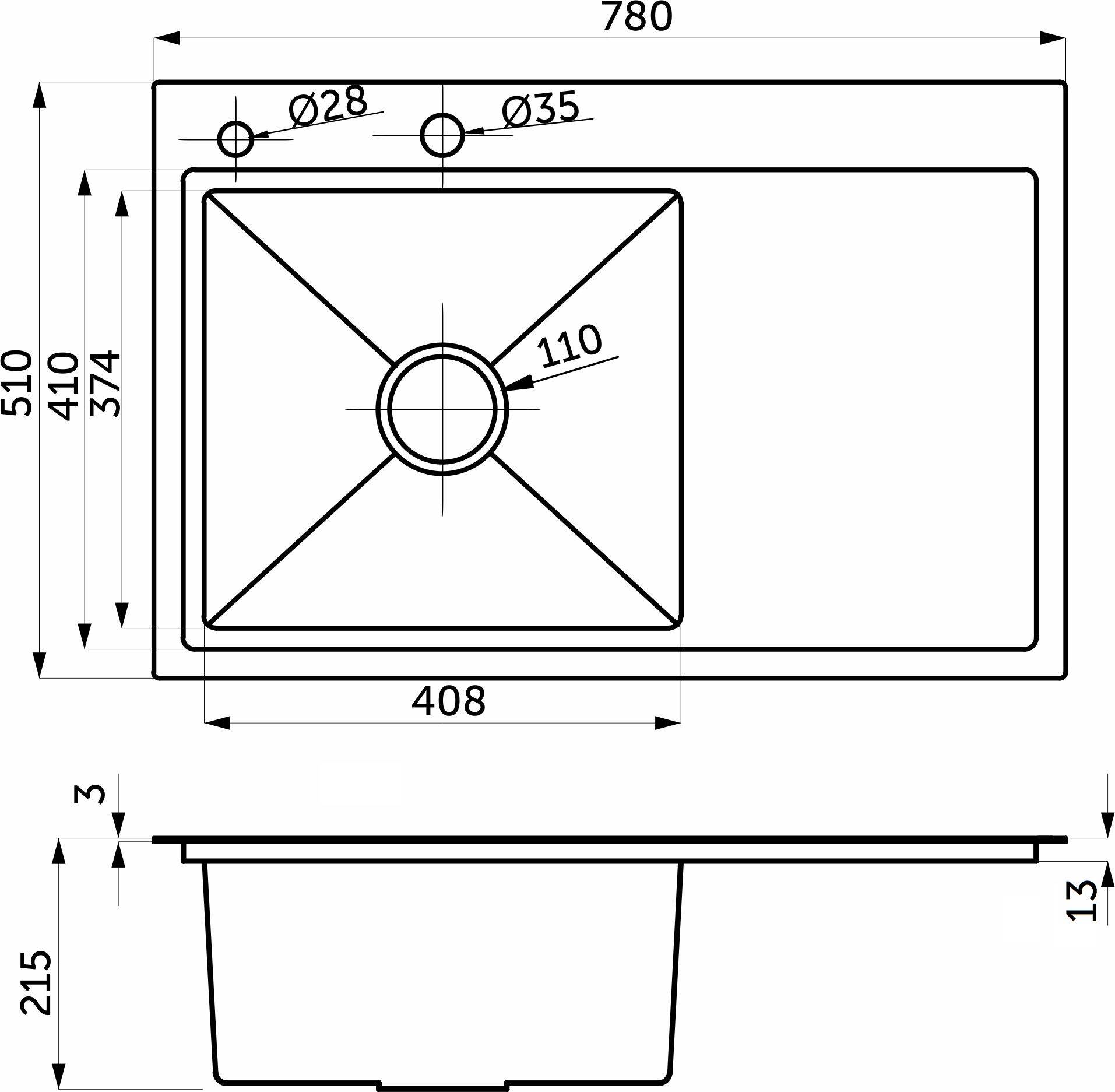 Мойка н/сталь, прямоугольная одночашевая, 780*510мм, сатин, PVD покрытие, мойка слева, с крылом, врезн на/вровень столешнице, AKS (3,2мм)