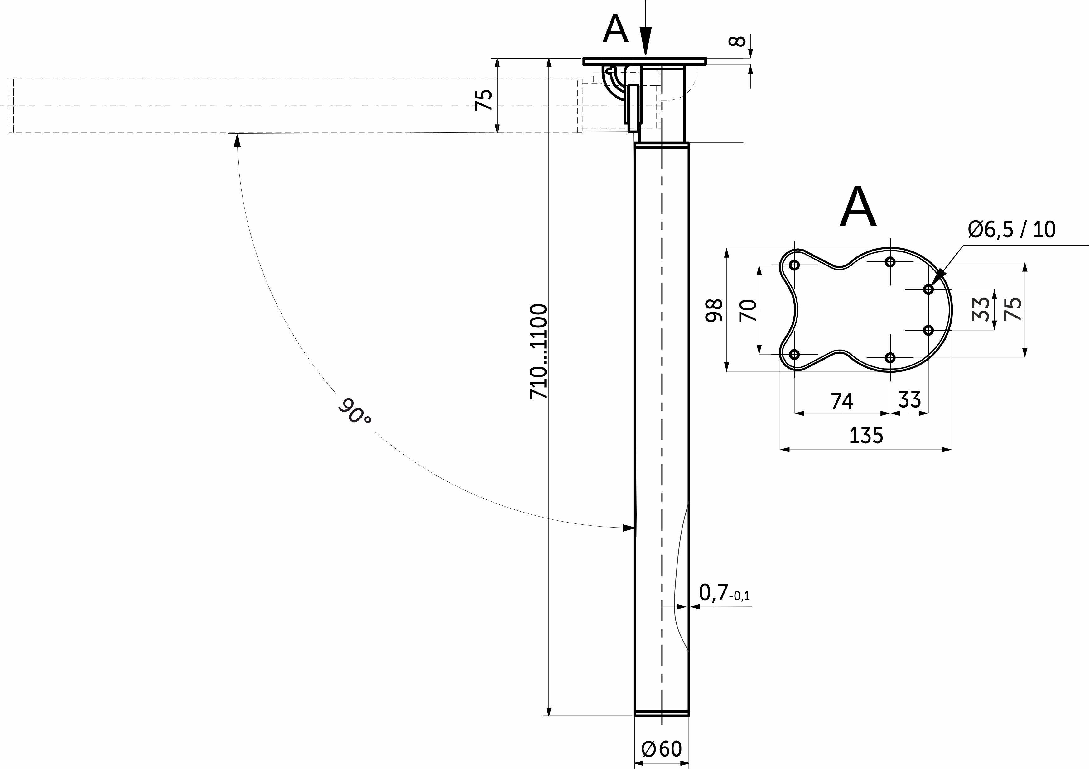 Опора мебельная складная с регулировкой высоты 710-1100 мм. Есть складной механизм (сложение на 90 градусов). Применяется для откидных столешниц либо складных столов