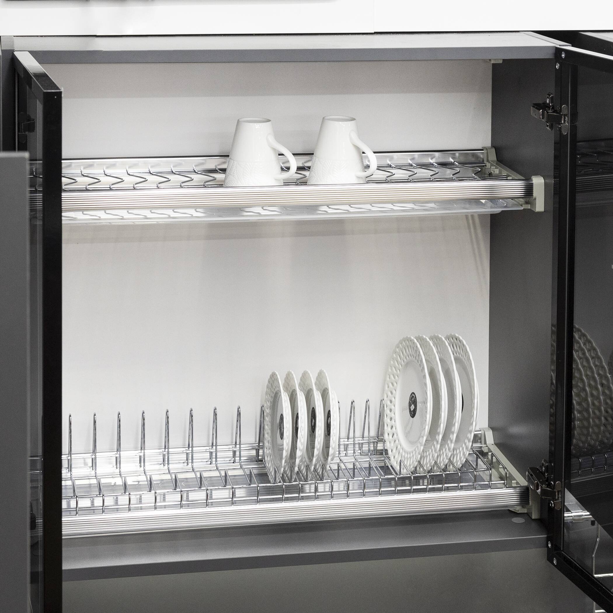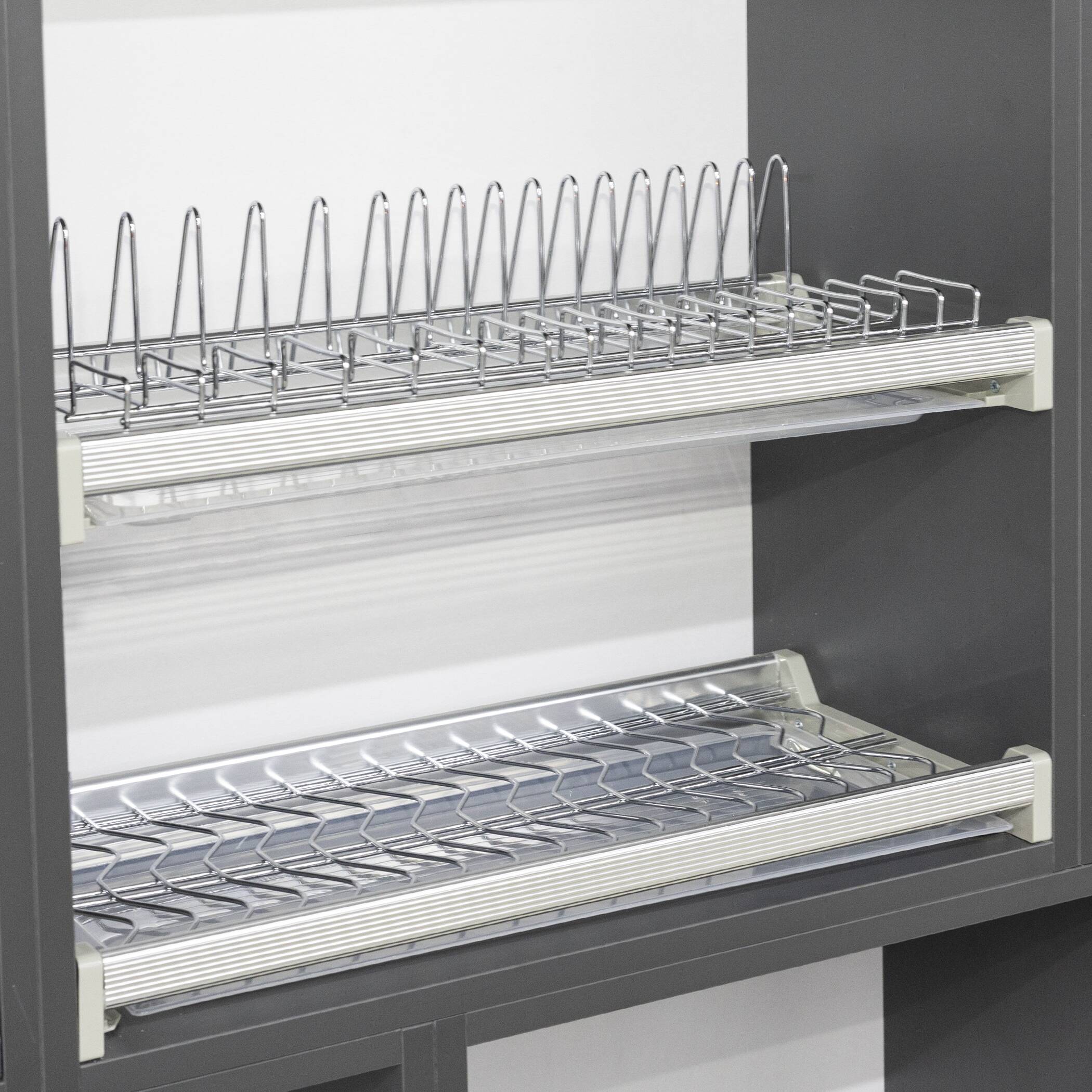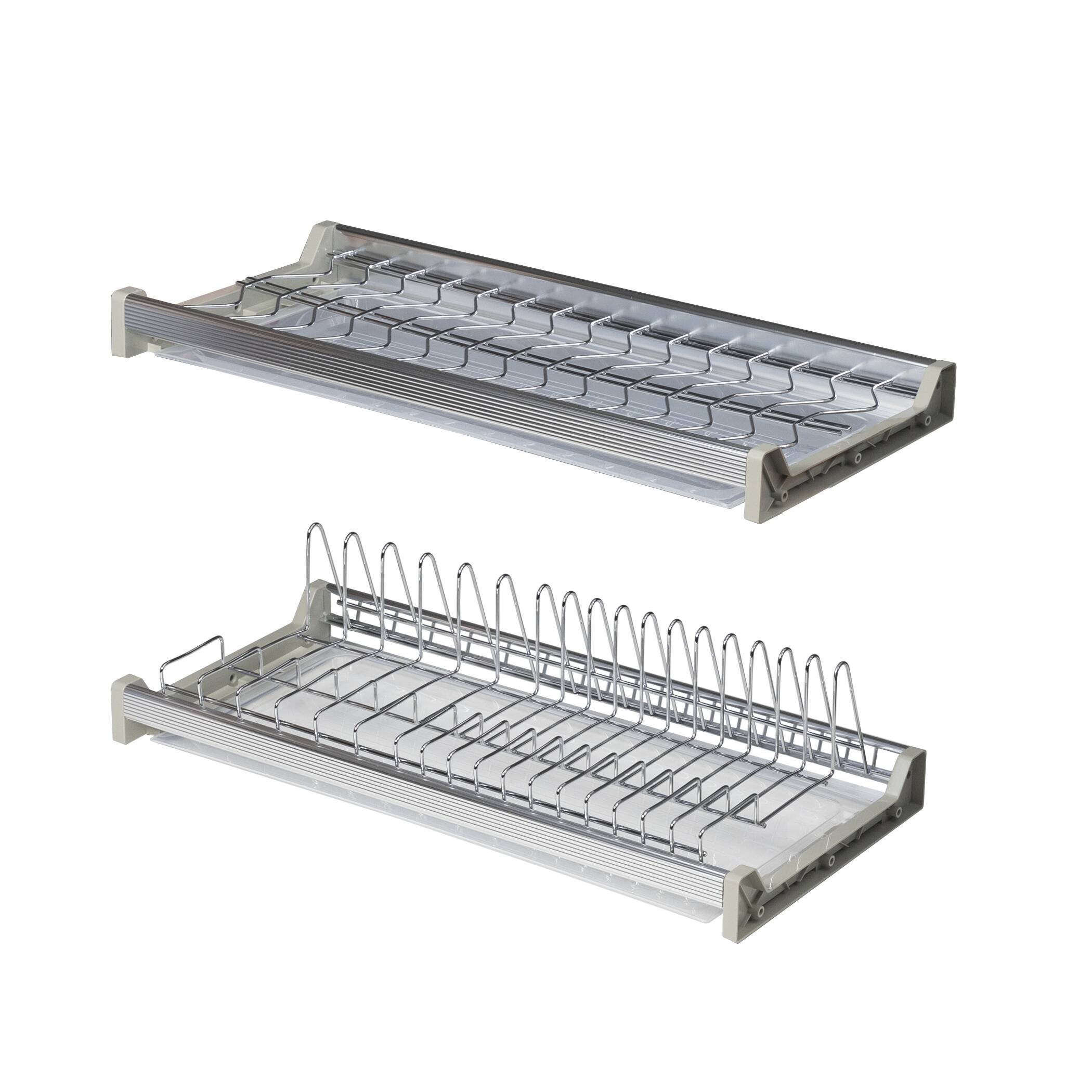 В комплекте: сушка для чашек - 1 шт., сушка для тарелок - 1 шт., поддон пластиковый (прозрачный) - 2 шт., крепление пластиковое (серое) - 4шт., профиль алюминиевый - 4шт., крепежный винт - 8шт.