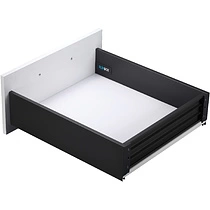 AKS же представил свой продукт с пожизненной гарантией и отвечающий всем необходимым требованиям современного мебельного рынка - SLIMBOX. Это современная система выдвижных ящиков, также представлена в вариации с механизмом push-to-open. Система имеет боковины толщиной до 12 мм, высотой 86, 128 или 175 мм и представлена в длинах от 300 до 500 мм. Благодаря тонким стенкам увеличивается вместимость выдвижного ящика на 20%. SLIMBOX представлен в двух цветах: белый и графит. В комплект входят: две боковины, пара направляющих, крепления фасада, заглушки, саморезы, инструкция. Чтобы изготовить выдвижной ящик в домашних условиях надо будет всего лишь самостоятельно сделать дно ящика, заднюю стенку и фасад. Бокс снабжен системой регулировки в 2-х плоскостях для фиксирования фасада относительно корпуса и соседних фасадов. Ящик способен выдержать до 45 кг постоянной эксплуатационной нагрузки, срок его службы составляет около 100 000 циклов открывания/закрывания. Системы Слимбокс обеспечивают плавное и плавное выдвижение и бесшумное закрывание.